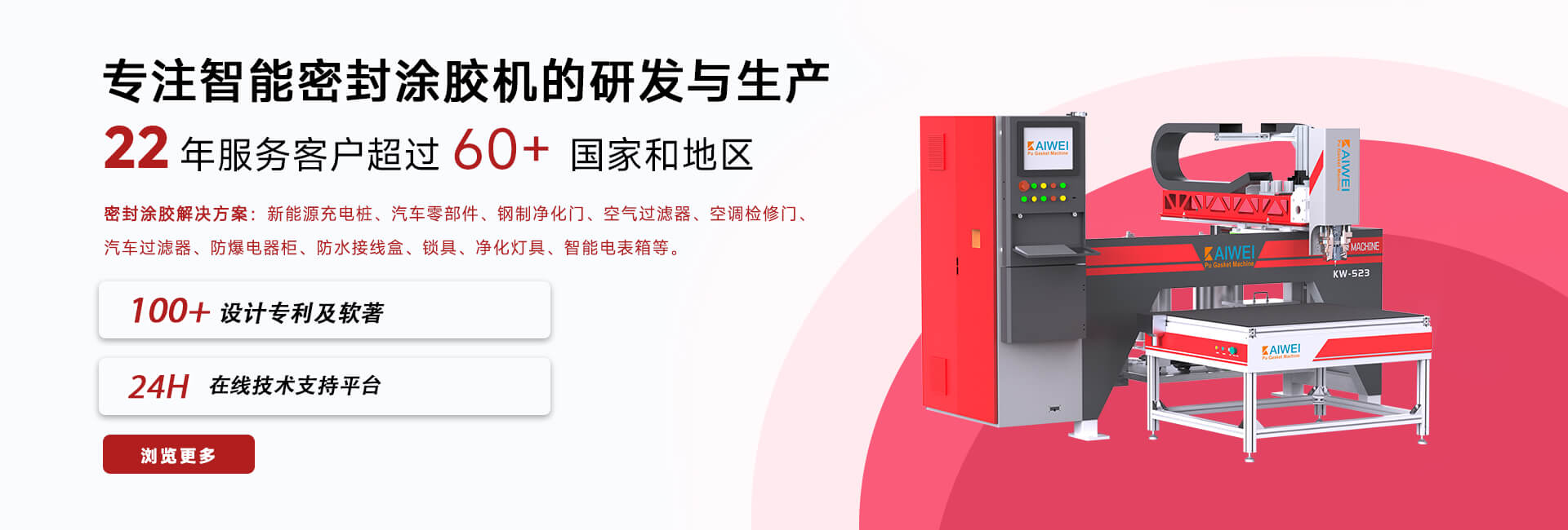 上海凱偉智能科技(集團)有限公司創建于2004年,總部位于上海,是一家研發和生產工業密封系統、機器人發泡設備的技術企業。公司擁有專業的研發機構,完善的技術創新機制,為國內外知名企業提供密封點膠解決方案。 凱偉堅持“以技術為先導,以人才為根本,以質量為生命,以信譽為基礎”的企業宗旨,擁有30多人技術研發人員,整體研發水平居國內同行業前列。取得機器人定量發泡機等技術獲得國家專利多項。主要產品包括全自動涂膠設備、聚氨酯AB雙組份點膠設備、PU密封涂膠機、鈑金機柜密封涂膠機、6軸機器人點膠設備等。如KW-510,KW-520,KW-523等常微量全自動雙組份涂膠機等機型,廣泛適用于新能源汽車、機柜、空氣過濾器、空調凈化設備、凈化門、空調檢修門、防爆燈具等領域。 凱凱偉涂膠機先后通過SGS、ROHS、CCC、CE、防護等級認證、ISO9001-2000國際質量體系等多個認證。公司擁有專業的研發隊伍,能為客戶提供技術可靠的產品及完整方案。同時具備完善的售后服務體系,可為客戶提供產品安裝、培訓小程序【凱易學】等良好的售后服務,其售后水平,獲得了客戶的一致認可和高度評價。全自動點膠機產品在暢銷國內的同時,遠銷德國、美國、意大利、越南、智利、俄羅斯、印度及中東、東南亞、南美等130多個國家和地區。